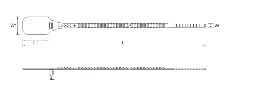 أختام الأمان، بطول 12.9" (330mm)، قوة شد 45lbf، منطقة العلامة 1.50 × 0.99 بوصة (38.0 × 25.2mm).