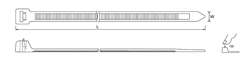 250lbf (113.4kgf) の引張強度。再利用可能ジップタイ、再利用可能ケーブルタイ、ジップタイ、タイラップ、ホースタイ、ザップストラップ、ワイヤータイ、ロッキングストラップ、ケーブルストラップ、ナイロンケーブルタイとしても知られています。
