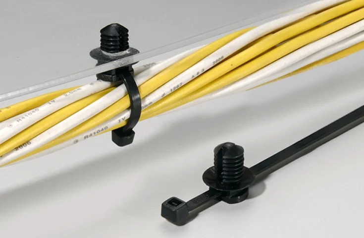 插鞘式固定配件需搭配束带使用,可任意调整插鞘在束带上的位置,穿束更方便。若搭配反穿式束带可保护线材,不刮伤线材表面。