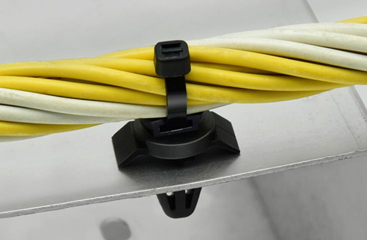 插鞘式束帶固定卡座搭配束帶可綑綁固定電纜電線。插鞘旁兩翼結構可幫助束帶穏固應用於高震動環境。